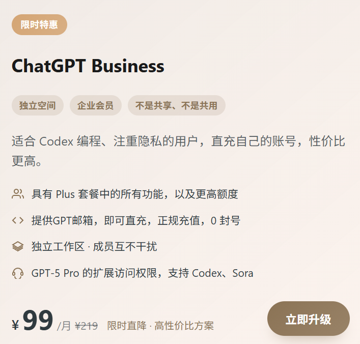 如果你想体验GPT Pro、日常使用GPT-5,且不介意1个月后备份聊天记录,ChatGPT Business性价比极高。适合小团队、企业用户或对“ChatGPT Team开通”感兴趣的开发者。