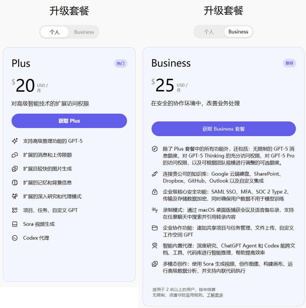 | 功能/特性 | ChatGPT Plus(个人版) | ChatGPT Business(团队版) |